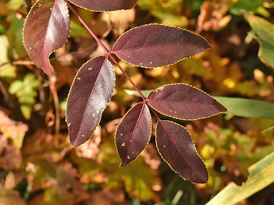 まるで縁どりがあるかのようなゴンズイの葉。これは葉裏の色が縁に沿って見えているから。ゴンズイの葉は秋に海老茶色に色づきますが、裏返すと薄緑色なんです。