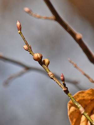 クロモジの冬芽。この姿で冬を越します。丸っこいのが花芽、シュッとした長いのが葉芽です。