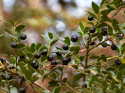 イヌツゲの枝に実がびっしりと付いていました。名前はツゲですが、櫛など木工品に加工されるのはツゲ科のツゲ。イヌツゲはモチノキ科で、形態も含めいろいろ違いがあります。