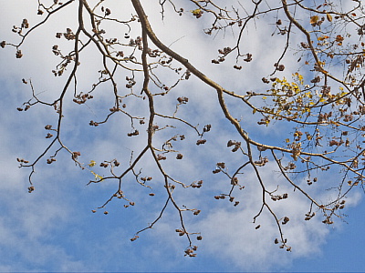 文字どおり見上げるような高木のカラスザンショウ。枝先にはまだ果序が付いています。