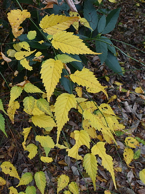 これはクロモジの黄葉。涼やかです。黄葉にもオレンジ色系もあればこのクロモジのようにレモン色系もあります。ミズキなどもレモン色系ですね。