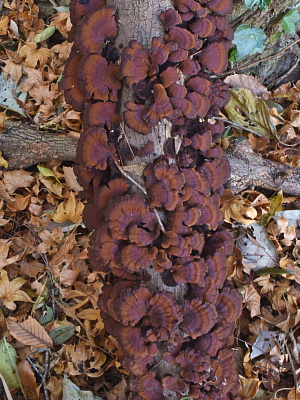 枯木の表面を覆っているキノコ。おそらくチャカイガラタケではないかと。茶色というより暗紫色で、よく見るとグラデーションの縞模様が美しかったです。