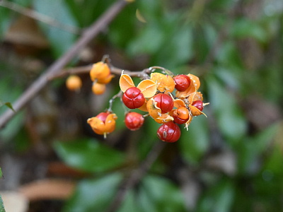 ツルウメモドキの果実。赤いのは仮種皮で、その中に小さな種子が入っています。殻との色の組み合わせがいいですね。