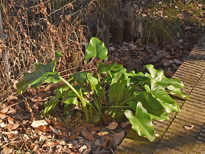 内裏池の畔に生えているカラー。他の植物が軒並み冬枯れ状態なのに、一人生き生きとした緑色です。生命力を感じます。