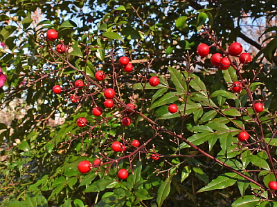ちょっと背景がごちゃついていて見にくいですが、ナンテンが実を付けています。今年は実の付きが良いようです。