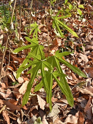 この鳥の足跡のような特徴的な葉は?葉の裂片の長さは大きいもので25cmくらいあります。調べてみるとトロロアオイのようですが、元々栽培用として育てられるものがなんでこんなところに。