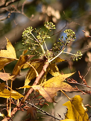 ハリギリの果実。枝に残る黄葉もいい色合いです。高木なので仰ぎ見るようにして撮りました。