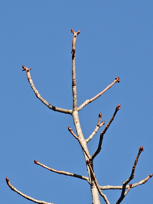 たくさんの蛇が立ち上がり首をもたげているかのような枝ぶり。これはミズキの枝です。太い枝を水平に伸ばし、そこから細い枝を上に向けて伸ばすのです。