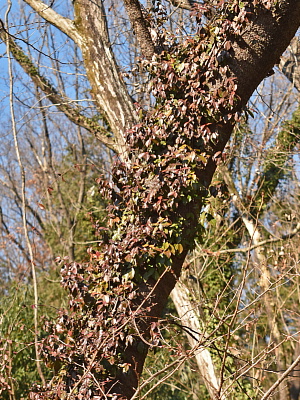 ヤマザクラの幹を覆うテイカカズラ。茎から気根(付着根)を出して取り付いています。ヤマザクラの方はやや枯れ気味。弱っているから取り付かれたのか、取り付かれたから弱ってきたのか、どっちだろう。