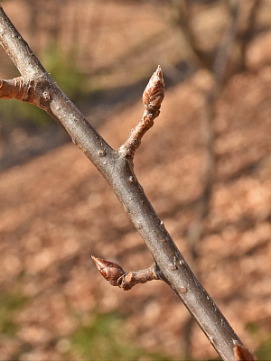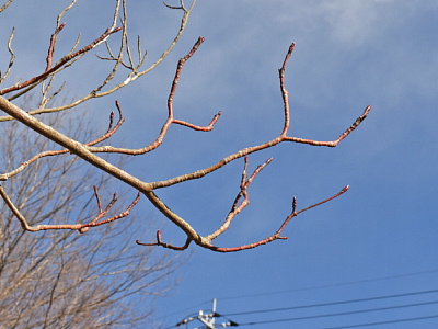 ヤマナラシの冬芽。葉が展開すると風に揺られてサワサワと、また、カラカラと鳴るように音がし、山全体が鳴っているようにも聞こえたことから名が付いたと言われています。確かにそんな音がします。冬芽の様子は中国の古武器「戟」みたいな感じです。