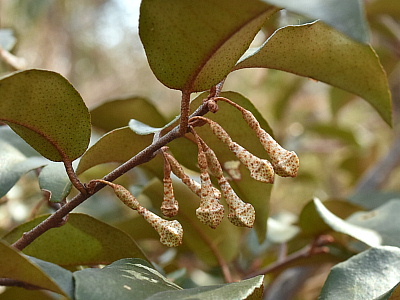 ツルグミの花。赤褐色の斑点は鱗状毛と呼ばれる微細な毛の集まりです。花は本来は晩秋に開花するはずですが、今の時期にこの姿だということはこのまま開花せずに落ちてしまうのかも。