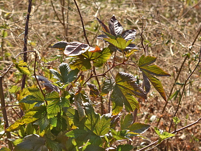 カジイチゴの葉。葉身は大人の手のひらよりも大きいです。図鑑では落葉低木とされていますが、写真のように青々とした葉で冬を越すものも珍しくないです。こちらも先日絡みつくクズの蔓などの撤去を行いました。