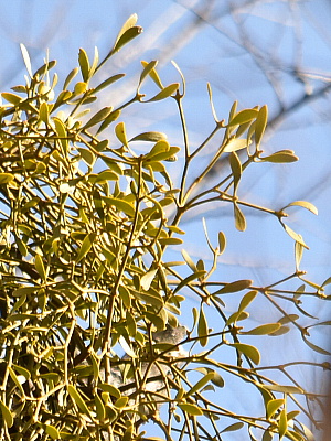 ヤドリギをアップで。地上7、8mくらいのところに着生しているので、望遠レンズをブレないように構えるのが大変です。ここ数年元気がなく、今年は実も付いていないようです。