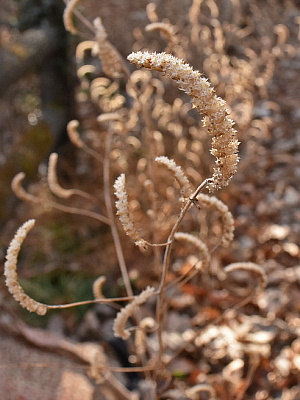 この日の午後、大田切北サンクチュアリ内で整備活動を。これはナギナタコウジュの花序。ドライフラワー化しています。それぞれの花序がアーチ状に丸まっていて可愛いです。