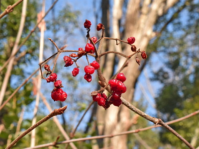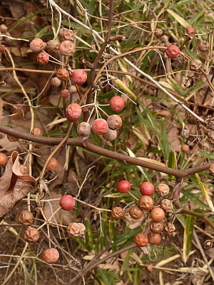 サルトリイバラの果実。液果と言われるタイプの果実で瑞々しい果肉を持つのですが、秋に赤く熟す頃には既に中身が空いてきていて、冬にはほぼスカスカになっています。