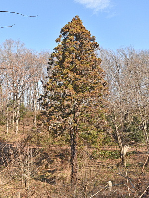 どんぐり畑に立つスギ。高さは15mくらいあります。ここ数年で樹勢が衰えてきたような感じです。