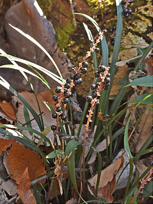 枯れ色に覆われる雑木林にあって、瑞々しい姿を見せているのはジャノヒゲの葉と種子。ここだけアップで見ると冬じゃないみたいです。