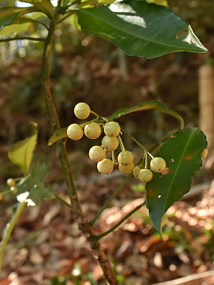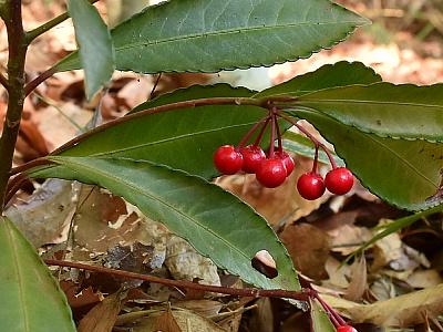 こちらは普通のマンリョウ。葉の縁が雲形になるのが特徴です。正月らしい植物ですが、クリスマスカラーでもありますね。
