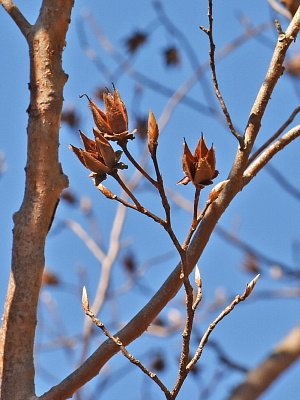ナツツバキの果実が開裂した姿。こうなるタイプの果実は種子を風に飛ばしたり揺り落としたりして子孫を増やすようです。