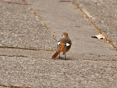 ジョウビタキのバックショット。特徴でもある翼の白斑がよく分かります。これを紋付の家紋に例えて、この鳥を「紋付」と呼ぶ地域もあるそうです。