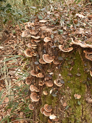 切り株の表面にチャカイガラタケが付いていました。扇のような子実体を触ってみるとカチカチ。とてもここから胞子が飛ぶとは思えない固さです。