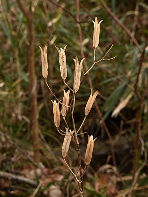 しゃれたシャンパングラスのようなこれはヤマジノホトトギスの果実。熟して先端が開き、乾燥しきっています。中にコインを積み上げるような形で種子が詰まっていて、それが風などで揺られてこぼれ落ちる構造になっています。